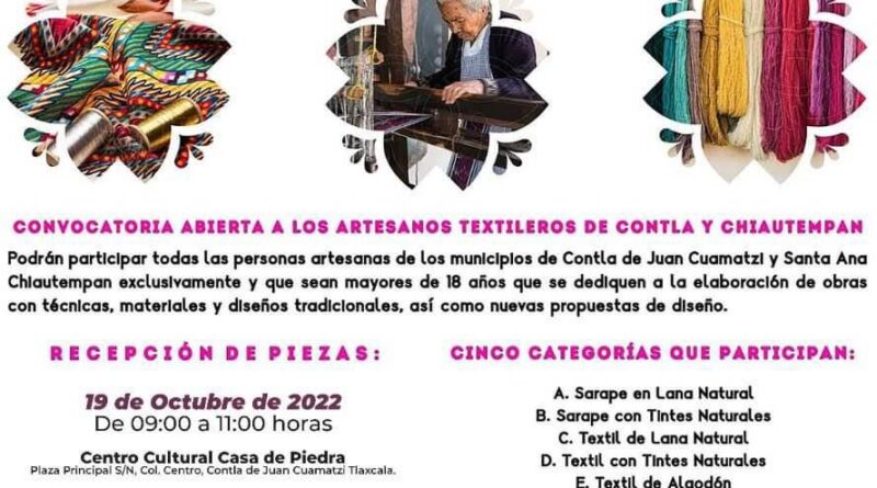 Con el objetivo de incentivar la elaboración de piezas textiles, cuya creación se distinga por su aportación cultural, preservando el uso de técnicas de tejido de lana y algodón con telares tradicionales, además de los tintes naturales; fue el motivo por el que Gobierno Municipal de Contla de Juan Cuamatzi, a través de la Secretaría de Cultura, Artesanía y Turismo (SECAT), informaron a las y los artesanos de la comuna a participar en la convocatoria lanzada por el Fondo Nacional para el Fomento de las Artesanías (FONART) y la Casa de Artesanías de Tlaxcala(CAT) y participar en el 11º Concurso Regional de Textiles, donde el registro y recepción de piezas, para mayor comodidad, será en la Casa de Piedra de esta demarcación.
