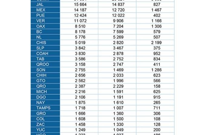 En contraste, los estados con menor número se encuentra Baja California Sur con 271, seguido de Tlaxclaa con 698, en el tercer sitio fue Aguascalientes con 764, le sigue Campeche con 820, Sinaloa con 821 y Morelos fueron mil 144.