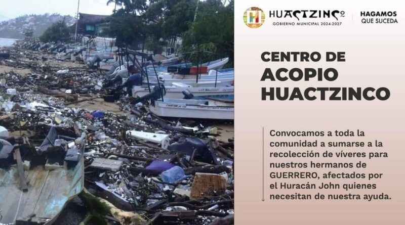 “El H. Ayuntamiento de Huactzinco, a través de la Dirección de Protección Civil y la Dirección de Deportes, convocan a la Colecta de Víveres para Guerrero. Los invitamos a sumarse con solidaridad y generosidad a esta colecta de víveres para apoyar a nuestros hermanos y amigos que han sido afectados por el paso del huracán John.
