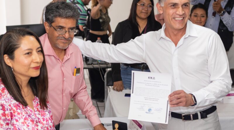Este jueves de manos de personal del Instituto Tlaxcalteca de Elección (ITE), recibió constancia de mayoría como presidente electo, Alfonso Sánchez García, señalar que tras el computo, registrando al final un total de 18,325 votos a su favor.