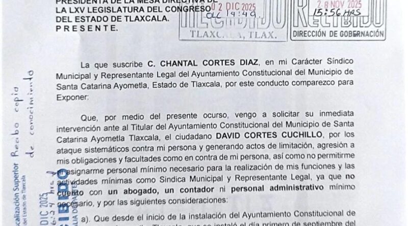 “Vengo a solicitar su inmediata intervención ante al Titular del Ayuntamiento Constitucional del Municipio de Santa Catarina Ayometla Tlaxcala, el ciudadano DAVID CORTES CUCHILLO, por los ataque sistemáticos contra mi persona y generando actos de limitación, agresión a mis obligaciones y facultades como en contra de mi persona, así como no permitirme asignarme personal mínimo necesario para la realización de mis funciones y las actividades mínimas como síndica municipal y Representante Legal, ya que no cuento con un abogado, un contador ni personal administrativo mínimo necesario”, dice el documento.