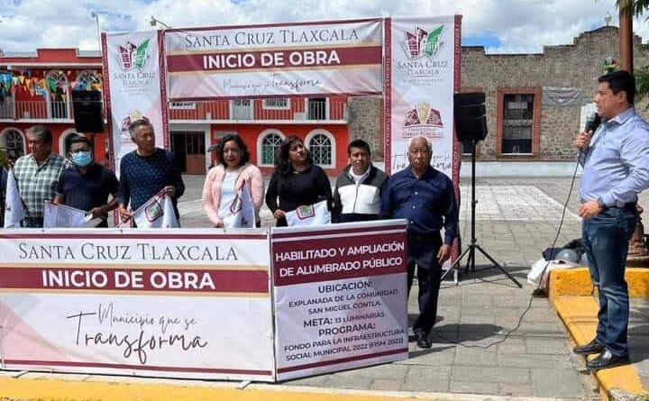 El presidente municipal de Santa Cruz Tlaxcala, David Martínez del Razo, informó que “dando continuidad a las acciones y reafirmando mi compromiso con la ciudadanía, dimos el banderazo de inicio de la obra con el Cuerpo Colegiado, la Presidenta de Comunidad y su servidor como presidente municipal de Santa Cruz Tlaxcala, para el mejoramiento de Alumbrado Público en la comunidad de San Miguel Contla, con la colocación de 13 luminarias del programa de Fondo para la Infraestructura Social Municipal 2022 (FISM2022)”.