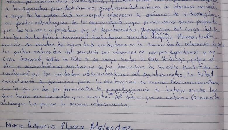 Finalmente, vecinos de esta comuna exigen a su alcalde Marco Antonio Pluma Meléndez que cumpla con el acuerdo que el mismo firmó ante más de 400 ciudadanos y despida al director de seguridad, ya que de seguir en la negativa amagan con cerrar la presidencia hasta que el alcalde cumpla con el acuerdo.