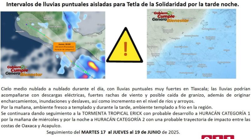 La Dirección de Protección Civil de Tetla de la Solidaridad, alerta a la ciudadanía ante las lluvias que se prevé se registren en los próximos días, además de que se prevé que los remanentes del posible huracán Erick, golpee las costas del estado de Guerrero, por lo que los remanentes podrían golpear a la entidad tlaxcalteca y a esta demarcación.