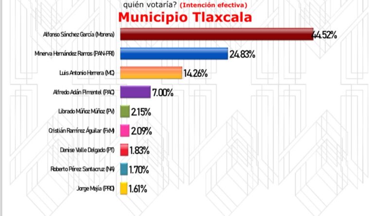 El morenista Alfonso Sánchez García, se encuentra a la cabeza en la contienda por la presidencia municipal de Tlaxcala, según las últimas encuestas, que le otorgan una ventaja de más de 19. 69 puntos porcentuales sobre su más cercana rival.
