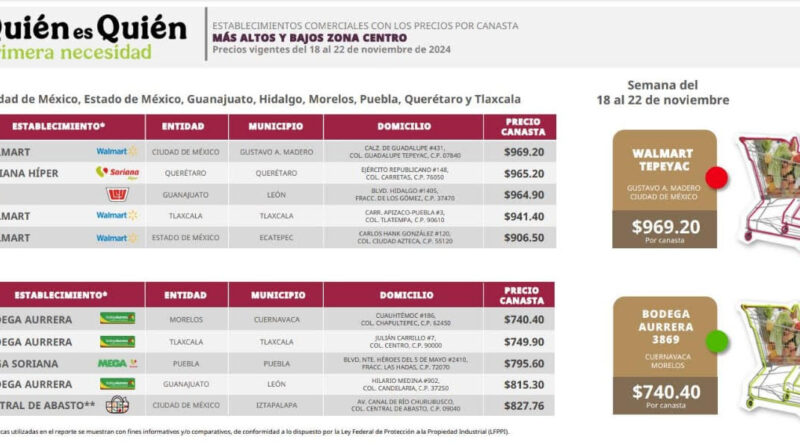 Los precios altos y bajos de la canasta básica vigentes del 18 al 22 de noviembre de 2024, fueron considerados para las entidades de la Ciudad de México, Estado de México, Guanajuato, Hidalgo, Morelos, Puebla, Querétaro y Tlaxcala.
