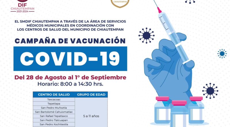 El Ayuntamiento de Chiautempan a través del Sistema Municipal para el Desarrollo Integral de la Familia (SMDIF) y en coordinación con los Centros de Salud del municipio, llevan a cabo una campaña de vacunación contra Covid-19.