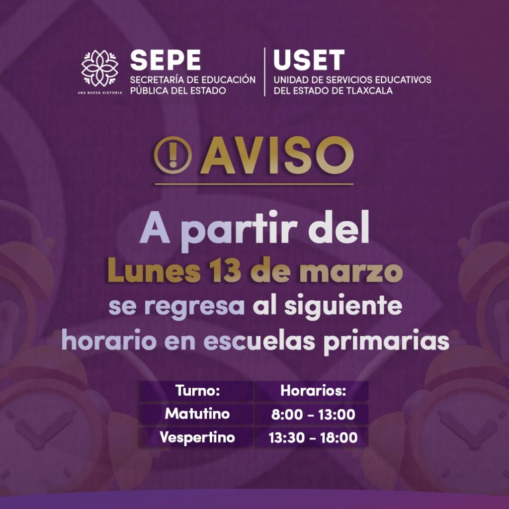 La Secretaría de Educación Pública del Estado (SEPE) y la Unidad de Servicios Educativos de Tlaxcala (USET) informa que a partir del lunes 13 de marzo las escuelas de educación primaria podrán regresa al horario normal en la entidad.