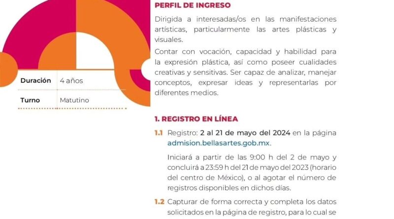 El registro es en línea y estará disponible del 2 al 21 de mayo del presente año en la página admision.bellasartes.gob.mx. Iniciará a partir de las 9 de la mañana del 2 de mayo y concluirá a las 23:59 horas del 21 de mayo o al agotar el número de registros disponibles en dichos días.