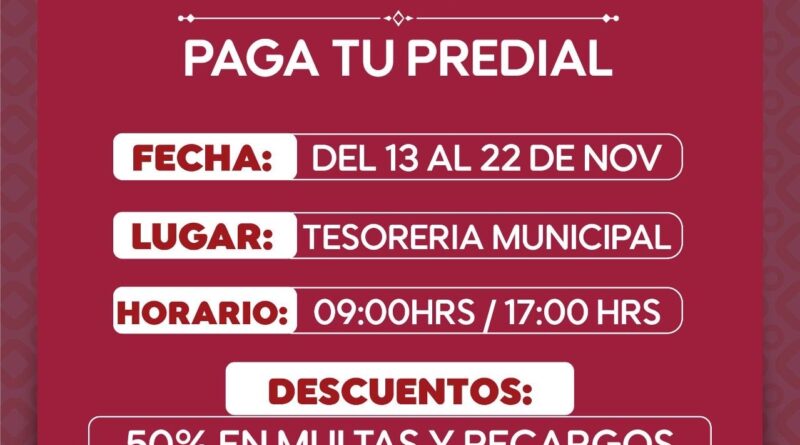Del 13 al 22 de noviembre del año en curso, los apizaquenses podrán ponerse al corriente con sus pagos gracias al descuento del 50 por ciento en multas y recargos y el 10 por ciento de descuento en pago actualizado 2024. La forma de pago podrá realizarse en efectivo o con tarjeta de débito o crédito a meses sin intereses.