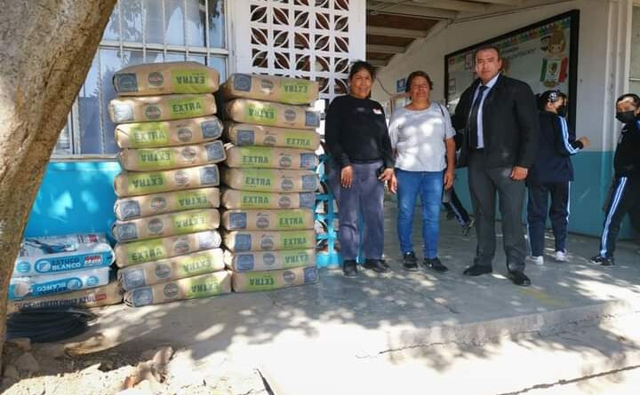 Apoya alcalde de Tetla con tonelada de cemento a Primaria Vicente Guerrero