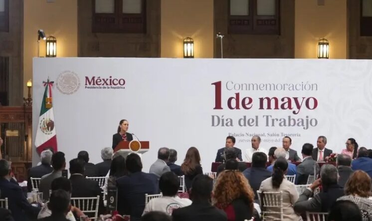El anuncio se dio durante la conmemoración del Día del Trabajo. Dirigentes sindicales acudieron al Salón Tesorería, en Palacio Nacional, donde comieron en compañía de la presidenta.