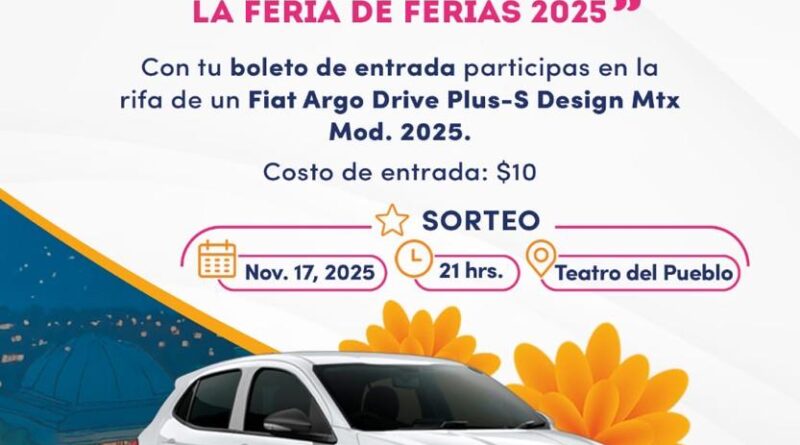 El Patronato para las Exposiciones y Ferias en la Ciudad de Tlaxcala anunció que los visitantes de “Tlaxcala, la Feria de Ferias 2025” podrán participar en el sorteo de un automóvil Fiat Argo Drive Plus-S Design MTX 2025, con solo adquirir su boleto de entrada general.