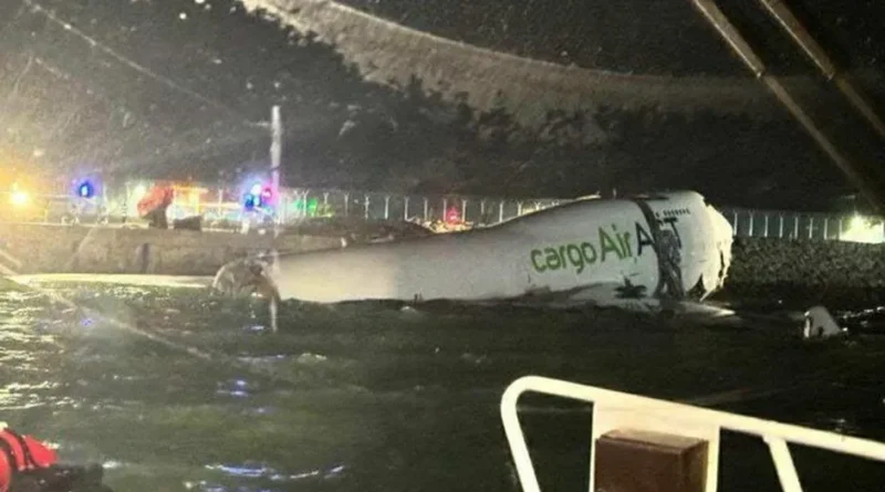 Un avión de carga se salió de la pista del aeropuerto internacional de Hong Kong y cayó al mar, situación que causó la muerte de una persona.