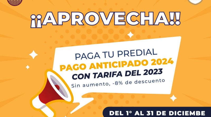 La primera es para las y los ciudadanos que se encuentren al corriente de su pago de predial, por lo que, el Ayuntamiento chiautempense invita a realizar el pago anticipado 2024, manteniendo la tarifa de 2023 (sin aumento) y con el ocho por ciento de descuento.
