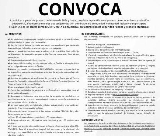 El Ayuntamiento de Tetla de la Solidaridad emitió una convocatoria para reclutar personal para operar el C4 Municipal, los interesados deberán acudir a las oficinas de la secretaría del ayuntamiento ubicadas en la presidencia municipal.