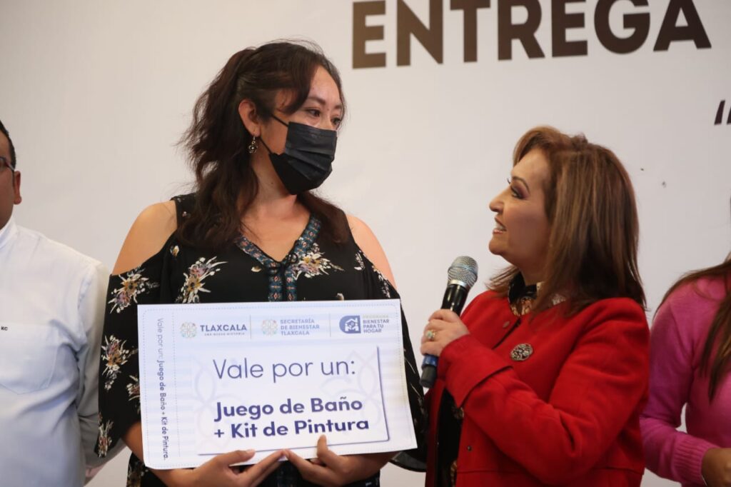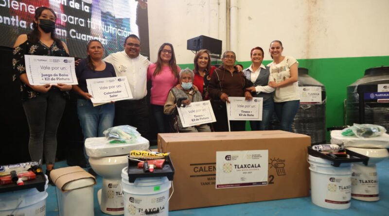 La gobernadora Lorena Cuéllar Cisneros entregó apoyos del Programa Bienestar para Tu Hogar a 142 familias vulnerables del municipio de Tetlatlahuca, consistentes en calentadores solares, tinacos y juegos de baño con kit de pintura, con lo que mejorarán sus condiciones de vivienda.