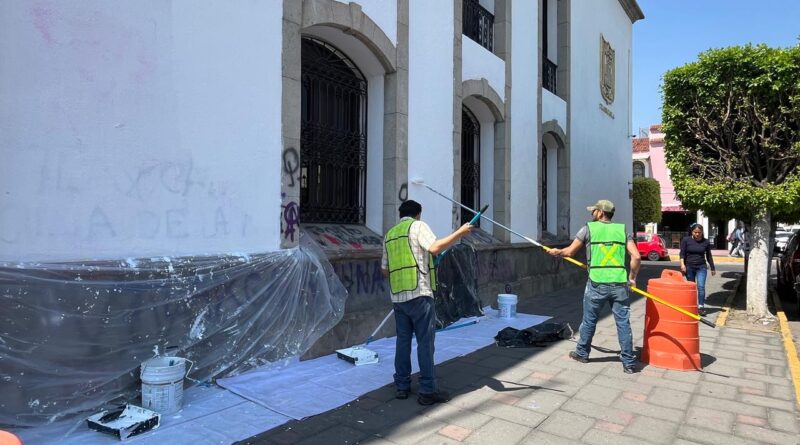 Trabajadores del ayuntamiento y de los poderes del Estado cubren con pintura las expresiones feministas dejadas tras la marcha del sábado