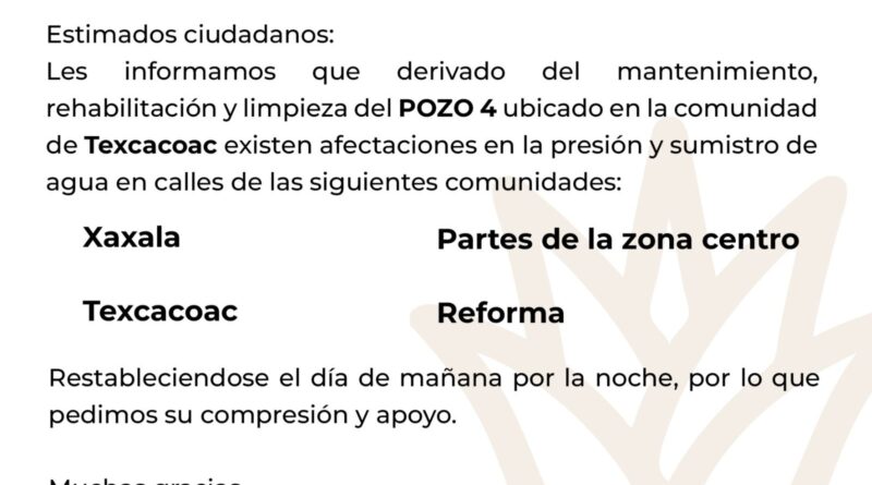 Por ese motivo existen afectaciones en la presión y suministro de agua en algunas calles de las siguientes comunidades: Xaxala, Texcacoac, Reforma y parte de la zona centro.