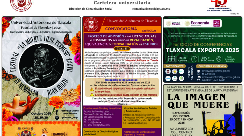 Cartelera de la Universidad Autónoma de Tlaxcala para publicarse el lunes 27 de octubre de 2025.
