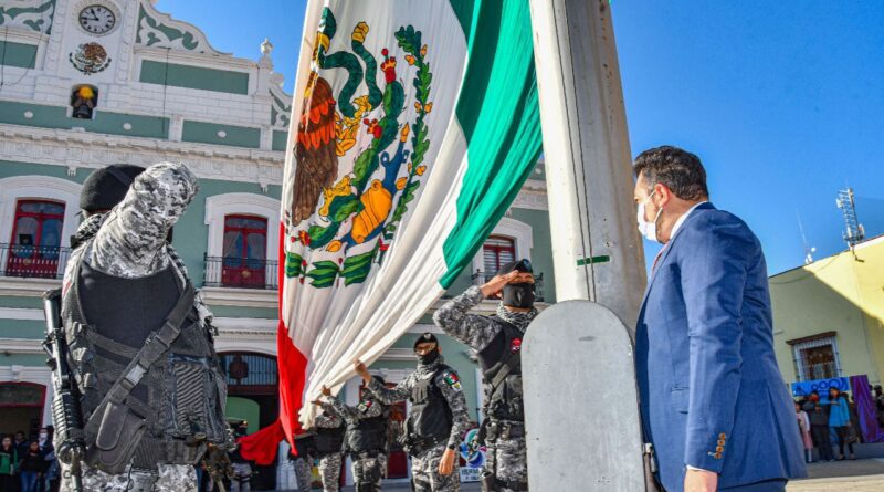 Frente al Palacio del Ayuntamiento, el edil de Huamantla señaló que desde pequeños se debe fomentar el amor y respeto a los tres símbolos patrios, que son la Bandera nacional, el escudo y el himno, que representan la historia y la soberanía de México.