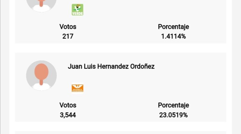 > Hasta la noche de este lunes 3 de junio, según el Programa de Resultados Electorales Preliminares (PREP), dio a conocer que con 3 mil 963 votos alcanzados y un porcentaje de 25,7772 por ciento, llevaba ventaja el candidato del Partido del Trabajo, Rodolfo López Dávila, y en segunda posición, estaba el candidato Morenista, Giovani Montiel López, quien había alcanzado hasta ese momento, 3 mil 869 sufragios, logrando un porcentaje de 25,1658, es decir, que con sólo 94 votos, se posicionaba el contendiente de la estrella a la cabeza.