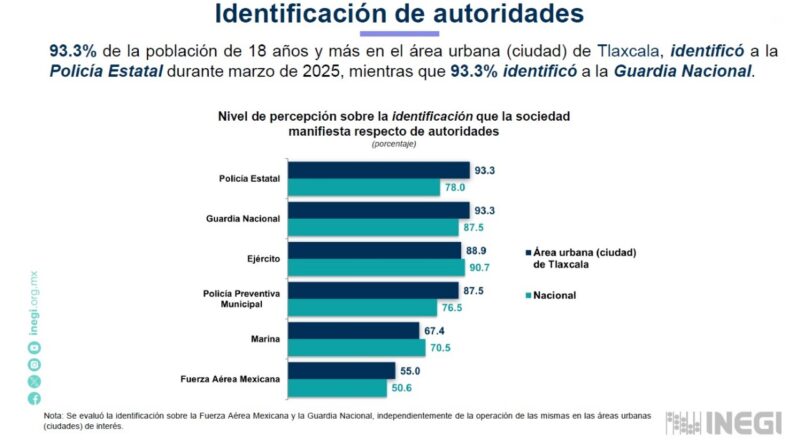 De acuerdo con los resultados de la Encuesta Nacional de Seguridad Pública Urbana (ENSU), correspondiente al primer trimestre de 2025, el 93.3% de la población de 18 años y más en la Ciudad de Tlaxcala, área urbana integrada por 25 municipios, identifica a la Policía Estatal, porcentaje equiparable al de la Guardia Nacional.