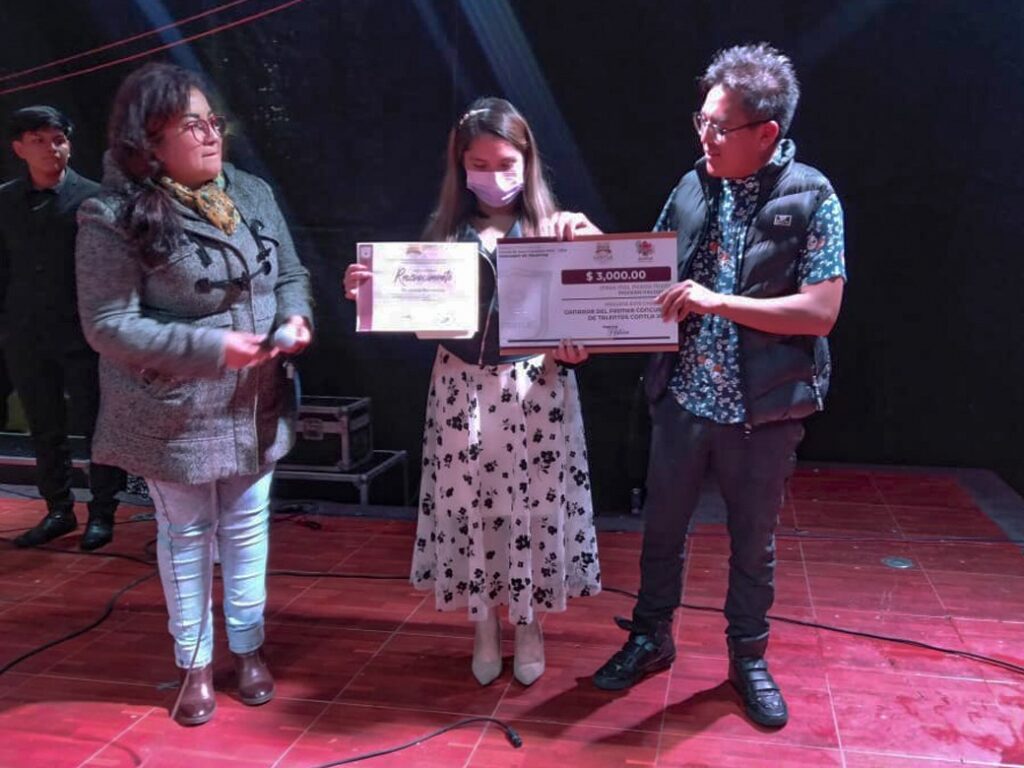 Al mismo tiempo, la coordinadora de Turismo de Contla, Miriam Selene Hernández García; en representación del Presidente Eddy Roldán, fue la encargada de entregar el premio de primer lugar que consistió en un estímulo de tres mil pesos a la ganadora a quien felicitó por este logro, resaltando que los jóvenes necesitan cada vez más espacios donde puedan desarrollarse y expresar sus ideas “…Con este premio, queremos reconocer el esfuerzo y talento que muestran día a día, en todos los lugares donde se desenvuelven” afirmó la coordinadora quien destacó que la ganadora del primer lugar, representará a Contla en el festival de talentos estatal a realizarse el próximo mes de noviembre y finalmente, agradeció la presencia de los jueces representantes de las secretarías de Turismo y Cultura del Estado quienes entregaron reconocimientos al segundo y tercer lugar.