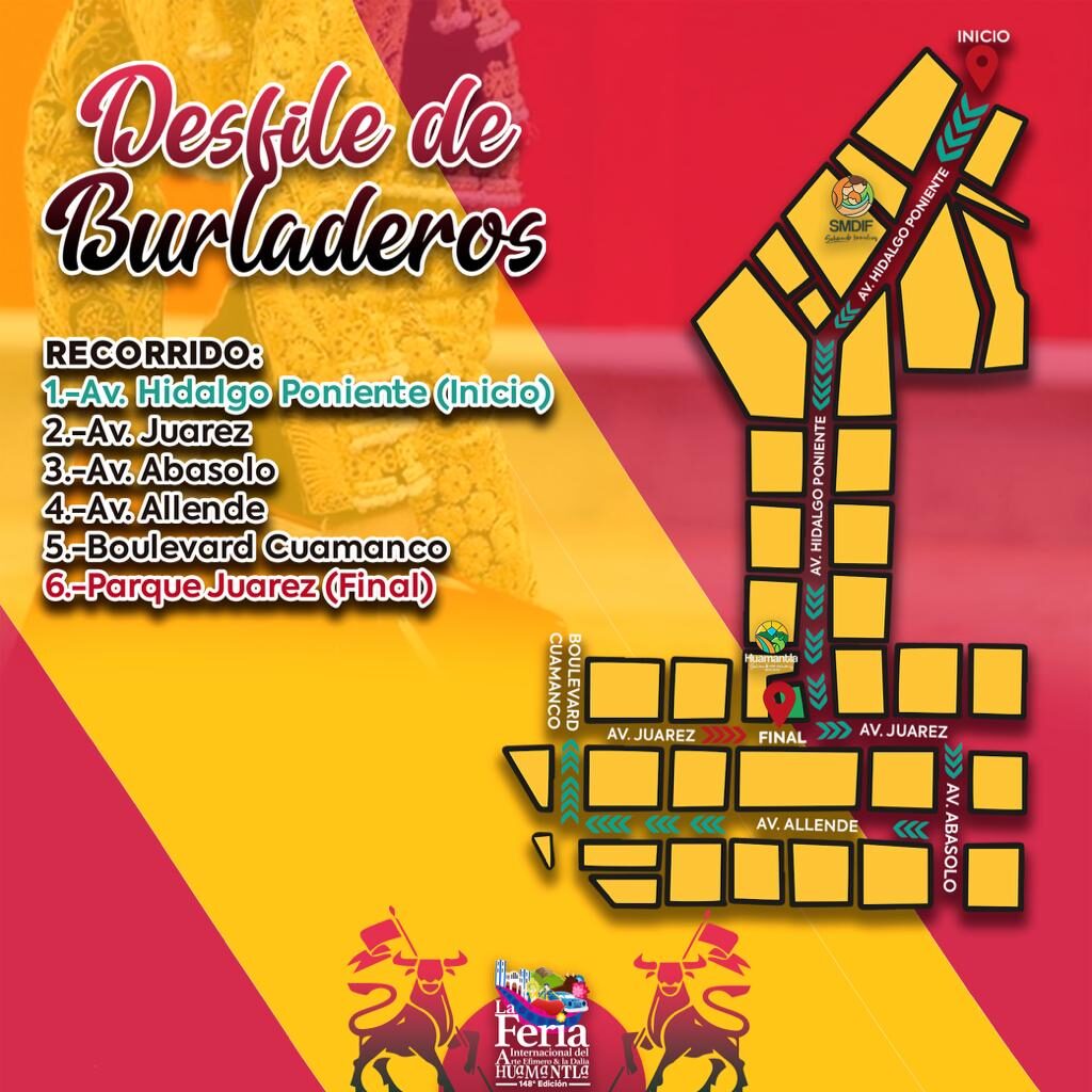 Santos Cedillo, mencionó que el “Desfile de Burladeros”, que este 2022 cumple sus primeros 20 años de realizarse, iniciará a las 19:00 horas en Calle Hidalgo Poniente, casi a la altura del Monumento al Toro, con dirección a la calle Juárez; ahí, dará vuelta hasta llegar a la Avenida Abasolo, y tomará Allende hasta el Bulevar Cuamanco; para incorporarse a la calle Juárez y terminar el recorrido en el Parque Hidalgo.