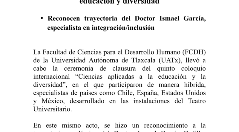 La Facultad de Ciencias para el Desarrollo Humano (FCDH) de la Universidad Autónoma de Tlaxcala (UATx), llevó a cabo la ceremonia de clausura del quinto coloquio internacional “Ciencias aplicadas a la educación y la diversidad”, en el que participaron de manera híbrida, especialistas de países como Chile, España, Estados Unidos y México, desarrollado en las instalaciones del Teatro Universitario.