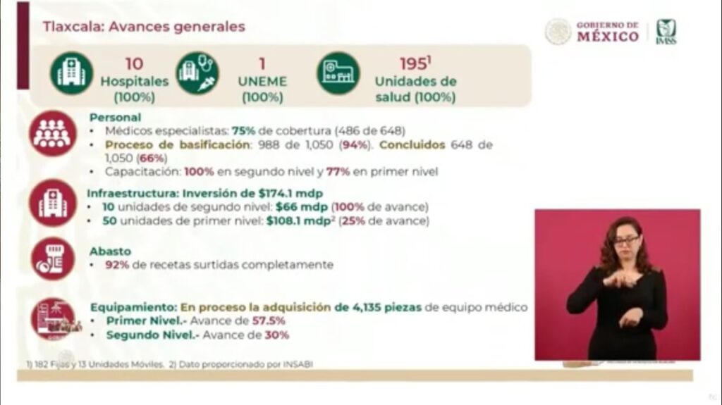 Robledo Aburto indicó que en Tlaxcala el IMSS-Bienestar tiene presencia en el 100 por ciento de unidades en 10 hospitales, una Unidad de Especialidad Médica -la UNEME de Detección y Diagnóstico de Cáncer de Mama- y 195 centros de salud, con una cobertura de médicos especialistas del 75 por ciento en todos los turnos.