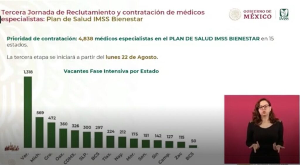 Será a través del gobierno federal que se abrirá la Tercera Jornada Nacional de Reclutamiento y Contratación de Médicos Especialistas, la cual abarcará los 16 estados que forman parte del Plan de Salud IMSS-Bienestar y entre los que está la entidad tlaxcalteca, donde se ha identificado la necesidad de contratar a 4 mil 838 profesionales de la salud.