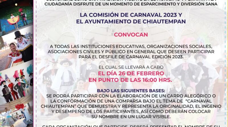 Con el propósito de promover, impulsar y conservar las tradiciones y costumbres del carnaval, el Ayuntamiento de Chiautempan a través de la comisión de Carnaval 2023, convoca a escuelas de todos los niveles educativos, organizaciones sociales, asociaciones civiles y público en general a participar en el desfile de carnaval “Traspasando fronteras” 2023.