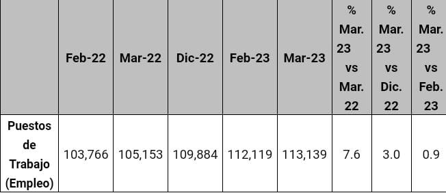 Sin embargo, el número de puestos de trabajo al 31 de marzo de 2023 es mayor al logrado al 31 de marzo, pero de 2022 por 7 mil 986 puestos, y es que, hace un año el número de trabajadores con seguridad social fue de 105 mil 153 empleos.
