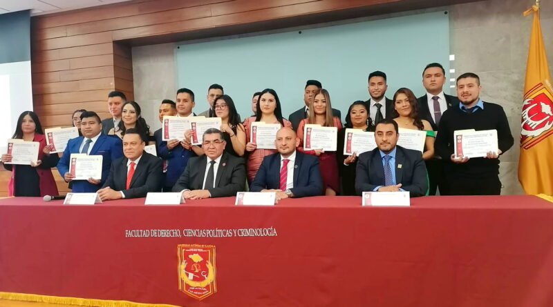Esta ceremonia de graduación contó con la presencia de la estructura directiva de la Facultad de Derecho, Ciencias Políticas y Criminología de la UATx.