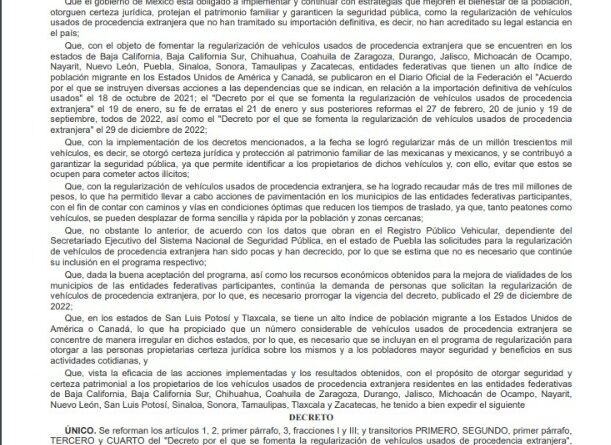 En cumplimiento al “Decreto por el que se fomenta la regularización de vehículos usados de procedencia extranjera”, emitido por el Gobierno de México, a través de la Secretaría de Seguridad y Protección Ciudadana (SSPC), el Registro Público Vehicular de Tlaxcala (Repuvet) iniciará dicha campaña a partir del próximo 10 de abril y tendrá vigencia en el estado durante un lapso de tres meses.