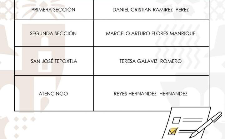 En este tenor señalaron que, para el caso de la primera sección, estará al frente Daniel Cristian Ramírez Pérez, en la Segunda Sección, estará Marcelo Arturo Flores Manrique, en San José Tepoxtla, Teresa Galaviz Romero y en Atencingo, será Reyes Hernández Hernández.
