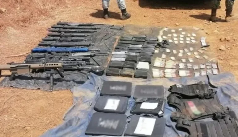 Además, se encontraron 10 fusiles de asalto; 645 cartuchos útiles de diferentes calibres; 32 cargadores para diferente armamento; 1 aditamento lanzagranadas calibre 40 mm; 3 chalecos tácticos y 6 placas balísticas.