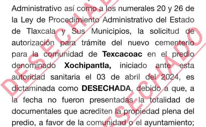 solicitud del trámite para la construcción de un nuevo panteón en Texcacoac ha sido desechada,