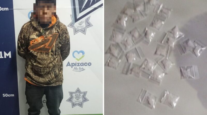A través de una denuncia anónima sobre la presencia de un masculino con comportamiento inusual, la policía de Apizaco, detuvo a presunto distribuidor de droga, que en ese momento portaba al menos 27 envoltorios con características físicas parecidas al “cristal”.