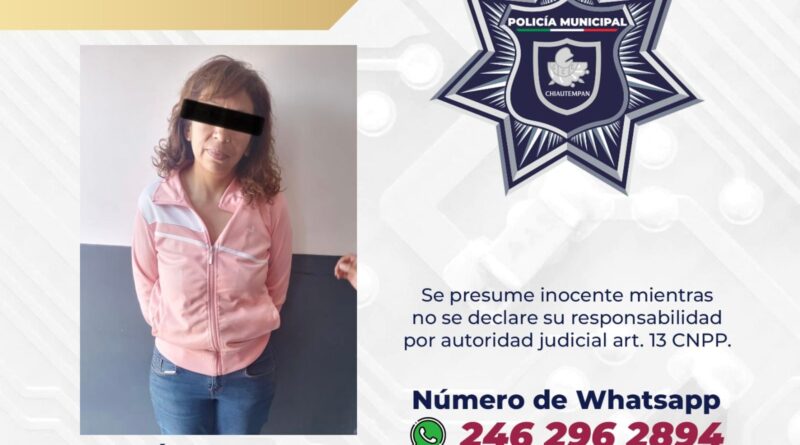 Elementos de la Policía Municipal de Chiautempan, detuvieron a una mujer que se encontró responsable de cometer el delito de robo a una tienda comercial, ubicada en la calle Antonio Díaz Varela, de la colonia centro.