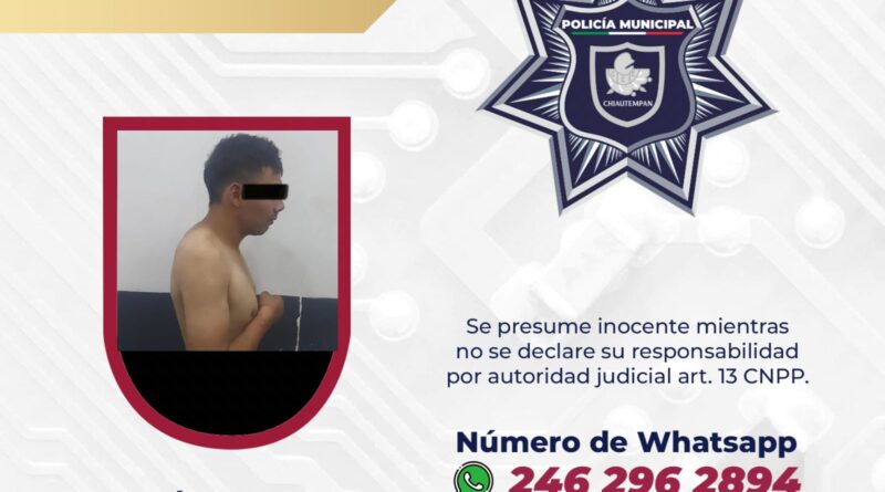 Así, la Policía Municipal de Chiautempan logró la detención y puesta a disposición de un hombre identificado como Roberto N., de 25 años por presunto robo.