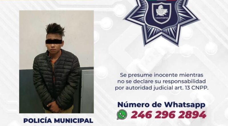 Elementos adscritos a la Dirección de Seguridad Pública Municipal, Vialidad y Protección Civil de Chiautempan, detuvieron a un sujeto por robo de pertenencias en agravio a dos menores de edad de identidad reservada.