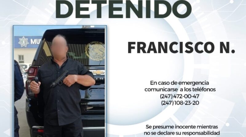 Durante la revisión de sus documentos, el sujeto expuso un objeto metálico con las características de un arma de fuego y al ser cuestionado sobre el permiso para portarla, el conductor, identificado como Francisco N., declaró no tenerlo, por lo que al estar ante la posible comisión de un delito, los oficiales procedieron a asegurarlo e informarle el motivo de su detención y sus derechos.
