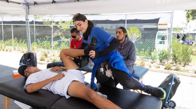 Michelle Alejandra Castillo Aviña, fisioterapista, llegó con el representativo de tenis de Jalisco; explica que, dependiendo de la disciplina, hay distintos tipos de lesiones. “Por ejemplo, ahorita estamos en tenis, aquí lo que solemos tener sobre todo es el cansancio muscular en los atletas por la sobre exigencia y aparte el estar debajo del sol teniendo partidos constantemente, para ellos es muy cansado, se llegan a fatigar mucho, entonces yo lo que tengo que hacer es recuperar al atleta para que en el siguiente partido él pueda jugar bien y no se sienta cansado”.