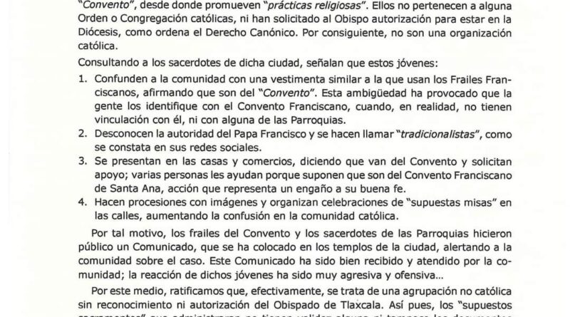 > En este escrito, señalan que ambas personas se encuentran actualmente en la Colonia Reforma en Chiautempan, lugar que le han llamado “Convento”, desde donde promueven “prácticas religiosas”, sin pertenecer a ninguna orden o congregación católica, ya que no han solicitado al Obispo autorización para estar en la Diócesis como ordena el Derecho Canónico, por lo consiguiente no son una organización católica.