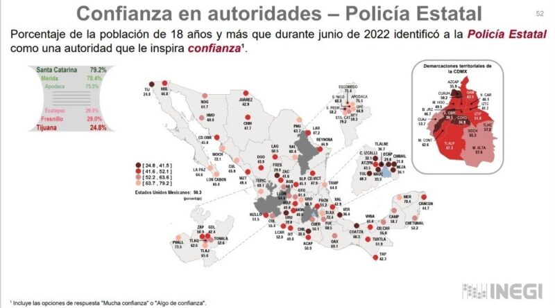 Destacan los porcentajes de la población que percibió el desempeño de las diversas autoridades de seguridad pública como muy efectivo o algo efectivo en sus labores para prevenir y combatir la delincuencia, el Ejército con un 71.8 por ciento, la Guardia Nacional el 62.2 por ciento, la Policía Estatal un 58.1 por ciento y la policía preventiva municipal el 40.1 por ciento.