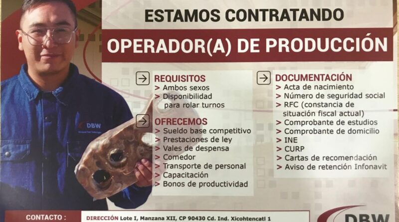 EL GOBIERNO DE HUAMANTLA INVITA A PARTICIPAR EN VACANTES DE EMPRESA DBW