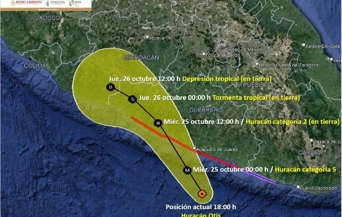 El huracán Otis se intensificó a categoría 4 en la escala Saffir-Simpson, el Servicio Meteorológico Nacional prevé que alcance la categoría 5 en las próximas horas.