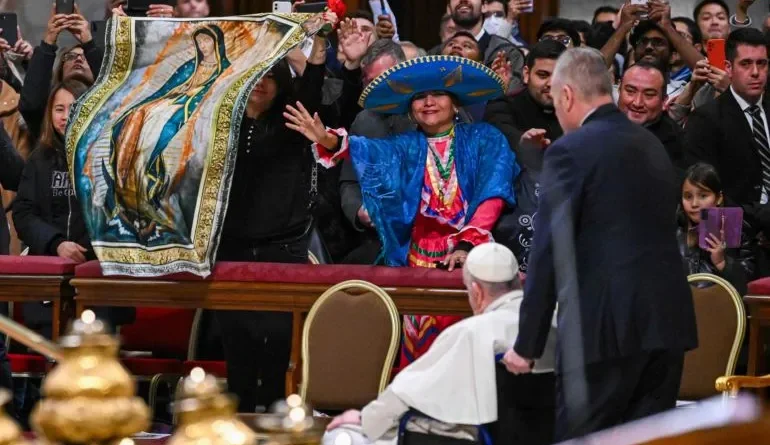 Acompañado de una imagen de la Virgen de Guadalupe, que se apoyó en una de las columnas del baldaquino diseñado por Gian Lorenzo Bernini, el Pontífice argentino sostuvo que «Ella está en medio de ese pueblo americano amenazado en su identidad por un paganismo salvaje y explotador, herido por la predicación activa de un ateísmo práctico y pragmático».